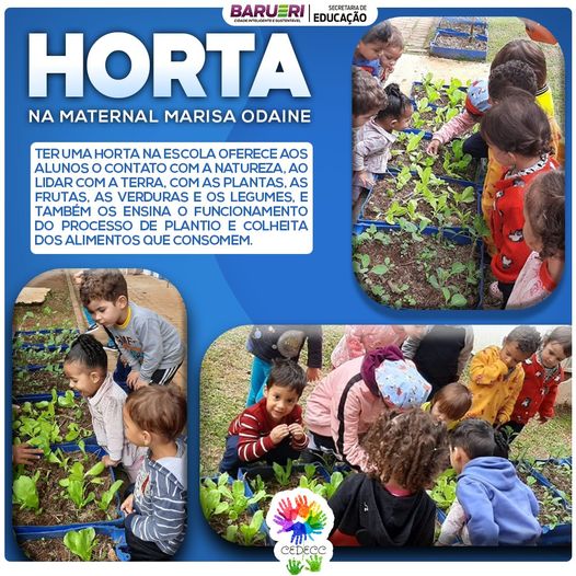 Ter uma horta na escola oferece aos alunos o contato com a natureza, ao lidar com a terra, com as plantas, as frutas, as verduras e os legumes, e também os ensina o funcionamento do processo de plantio e colheita dos alimentos que consomem.